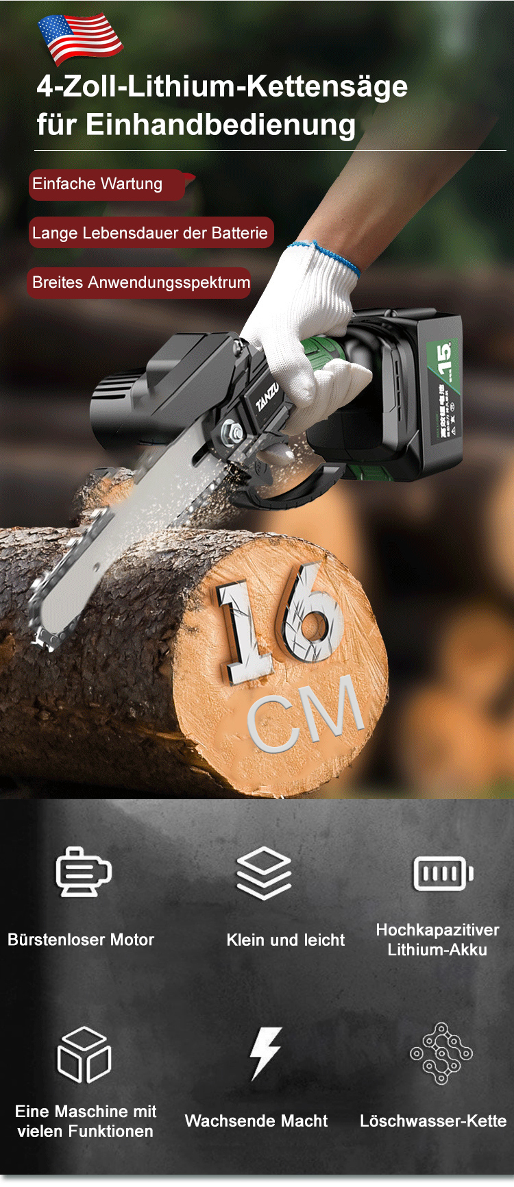 4-Zoll-Lithium-Kettensäge für Einhandbedienung
